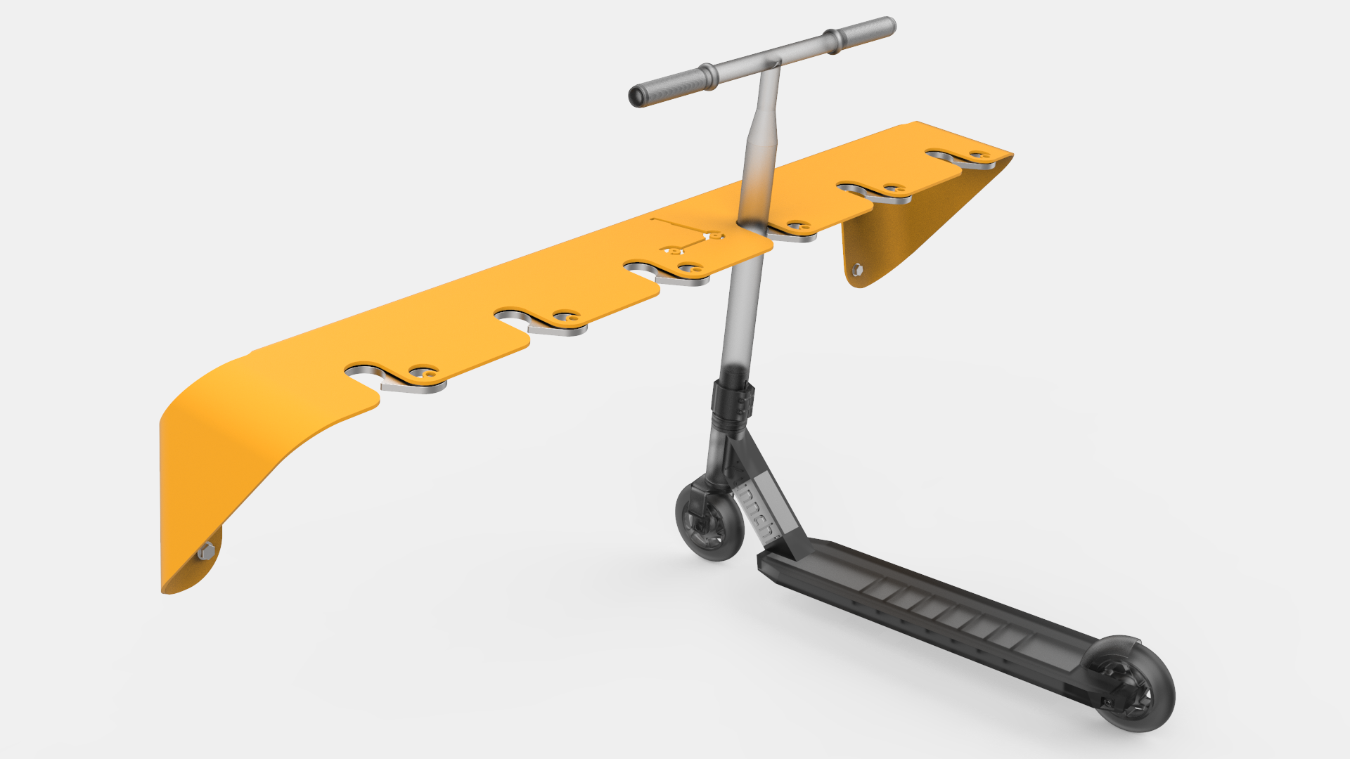 This project aimed to create a practical and easy-to-use scooter rack for schools, making it effortless for students to park and secure their scooters. The design is based on simplicity and efficiency, using a single folded steel sheet to form the structure. A spring-loaded latch automatically locks the scooter’s steering tube in place, while a double opening allows for easy padlock attachment, ensuring security. With its minimal components and straightforward assembly, this design is both cost-effective and highly durable, perfect for everyday use in school environments.